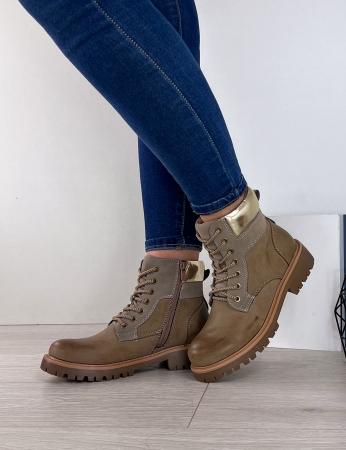 Caña corta, puntera redondeada, cordones delanteros con ojales metálicos, cremallera lateral para facilitar el calce, detalles en diferentes colores (dorado y beige) en la parte superior de la caña, suela robusta de tractor.
