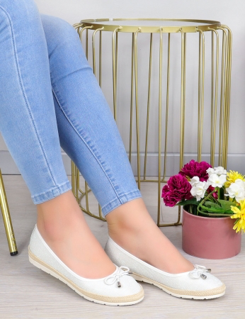 Estas bailarinas blancas planas, con detalles texturizados en la parte superior y entresuela en tono natural, lucen un lazo decorativo. Son prácticas y cómodas, ideales para el día a día, con un estilo sin cordones.