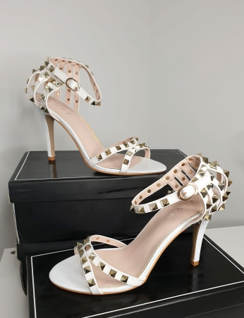Sandalia de tacón alto con tiras finas adornadas con tachuelas piramidales. Tiene una tira en la puntera, otra en el empeine y una tira con hebilla en el tobillo.