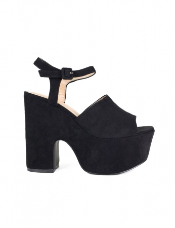 Sandalias negras de plataforma con tacón ancho y aberturas, y cierre de hebilla en el tobillo. Presentan una tira ancha en el empeine y la puntera abierta, ideales para un estilo casual pero a la moda, especialmente en climas cálidos.