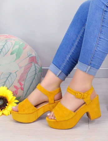 Estas sandalias de ante amarillo con plataforma y tacón de madera presentan un diseño de punta abierta y cierre de hebilla en el tobillo. Son versátiles y se pueden usar con looks casuales o más formales, y destacan por su tacón medio.