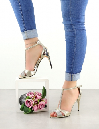 Tacón de aguja alto y fino. Presenta una fina tira sobre la puntera con detalle de pedrería y una tira en T que sube por el empeine hasta el tobillo, donde se cierra con una hebilla. El acabado metálico le da al zapato un brillo sofisticado.