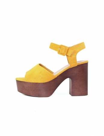 Estas sandalias de ante amarillo con plataforma y tacón de madera presentan un diseño de punta abierta y cierre de hebilla en el tobillo. Son versátiles y se pueden usar con looks casuales o más formales, y destacan por su tacón medio.